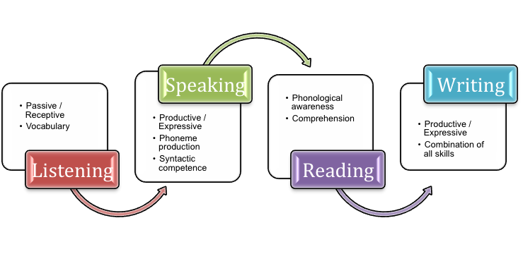 Researchers distinguish between three types of bilingualism. Simultaneous bilingualism – exposure to two languages from birth; early successive bilingualism – first exposure aged 1 – 3 years; and second language bilingualism – first exposure aged 4 – 10 years. There is considerable debate as to what exactly the “critical” ages are for successful language learning. As Kirsten Winter pointed out “Language learning is a continuum and bilingualism is not a perfect status to be achieved.” (Winter, 1999, p. 88). Typical language learners cycle through alternating stages of passive (receptive) and productive (expressive) skills, usually in the order of listening, speaking, reading and then writing.