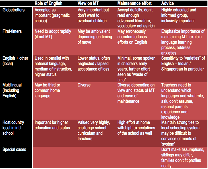 The International school context results in a number of issues that complicate MT provision, including the multicultural and multilingual nature of the student population, resulting in ‘fictive monolingualism’ and the transience of both the student and teacher population, with the resultant socio-psychological implications on learning (Caldas & Caron-Caldas, 2002; Hacohen, 2012; Hornberger, 2003). However, where the “cultural capital” of the school included valuing language diversity in its environment and teaching practise, students had an increased sense of belonging, higher levels of reading literacy and they scored significantly higher academically. Continued development of ability in two or more languages on a daily basis resulted in a deeper understanding of language across contexts. Best practice includes a well structured MT program with at least some inclusion in the school timetable and fee structure, inclusion of other subject matter in MT lessons, support for English acquisition through a daily ESL/EAL program, a socio-culturally supportive environment, better awareness and training for subject teachers, affirmation of students’ identity as bi- or multi-lingual and collaboration with parents, while block scheduling was not optimal for language learning (Carder, 2014; IBO, 2011; Tramonte & Willms, 2010; Vienna International School, 2006; Wallinger, 2000). Research in heritage language (HL) teaching and learning indicates that macro-approaches and other specific strategies that build on learners’ existing language skills could be leveraged to improve reading and writing abilities, increase motivation and participation and validate students’ identity although specific teacher training for HL is recommended (Lee-Smith, 2011; Wu & Chang, 2010).