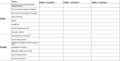 Do a language audit for your family so you have a realistic idea of what you can do to ensure success. Look at all aspects that contribute to success including the child, family, school and community. Make some strategic choices and frame your goals and priorities as a result of this. You can see my audit here.