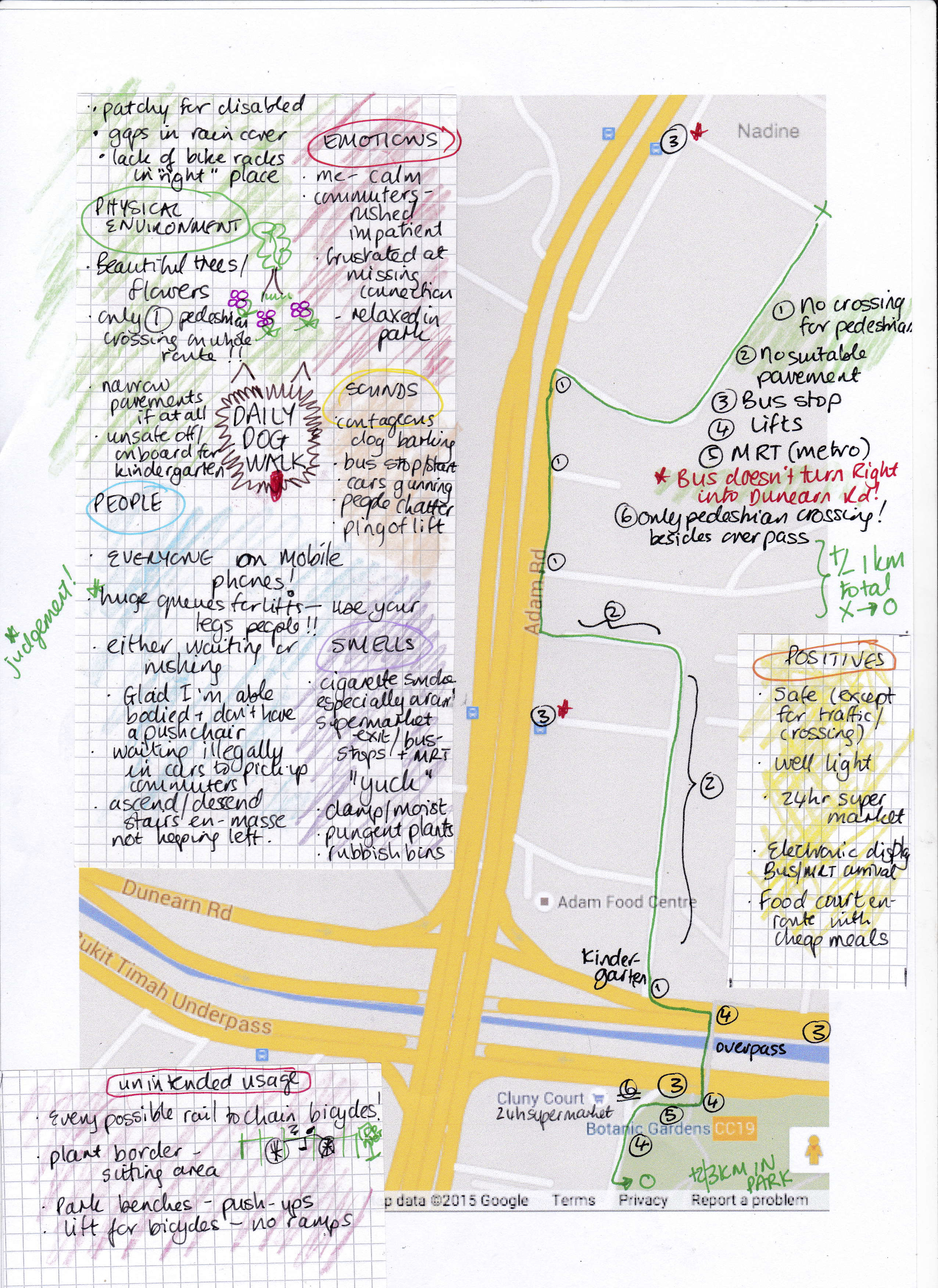 I undertook a dog walk observation exercise where I considered the first stage of the Luma Taxonomy of Innovation – looking (Luma Institute, 2014). My route from home to the Botanic Gardens is roughly 1km and it takes me past a fairly busy transport hub of bus stops and a MRT (mass rail transport) station. Other touch points are a busy food court (Adam Food Centre), a Kindergarten, a church, and a shopping centre with a 24-hour supermarket. As an able-bodied person I employed the technique of “user journey” and “adopting personas” (McNabola et al., 2013) in order to better understand the landscape. It is a route I also sometimes cycle with my children in order to reach the sports fields near the Botanic Gardens, so I considered that experience.