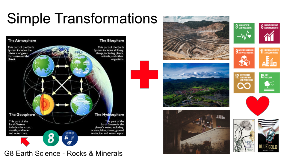 The idea is that you still have the science content as core to the unit – in this case Earth Science and learning about Sedimentary, igneous and metamorphic rocks and the minerals they contain and mining and the products of mining. But to that you add the environmental and human impact, and the lens of the SDGs (Sustainable Development Goals). And in order to help build empathy and understanding, add some literature.