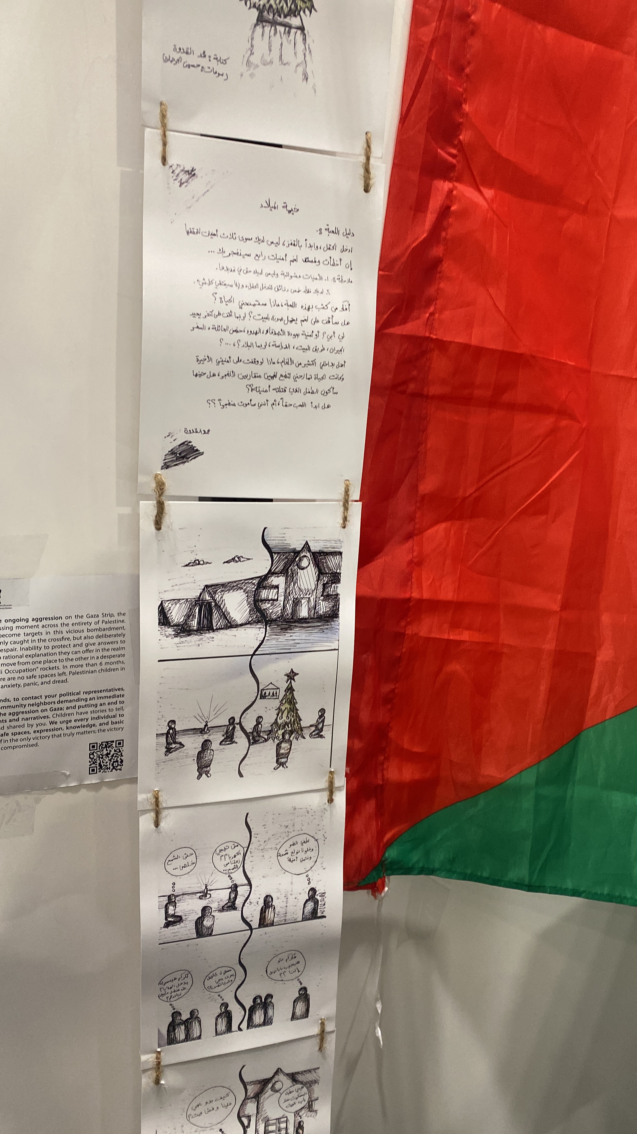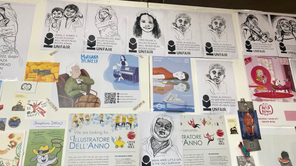 Following the issues around the 2023 LiBeraturpreis which was to be awarded to Adania Shibli, at the Frankfurt book fair last year, I was interested to see how and if dissent and awareness of geo-political issues would be handled in Bologna. There appeared to be a guerilla type of image bombing in the illustrator walls, some of which seemed to appear and disappear. Both Isreal and Palestine had representation.