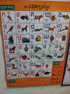 | Look carefully at the choice of word for this alphabet poster – what were they thinking? And no, it doesn’t make sense in Khmer either, I checked. |