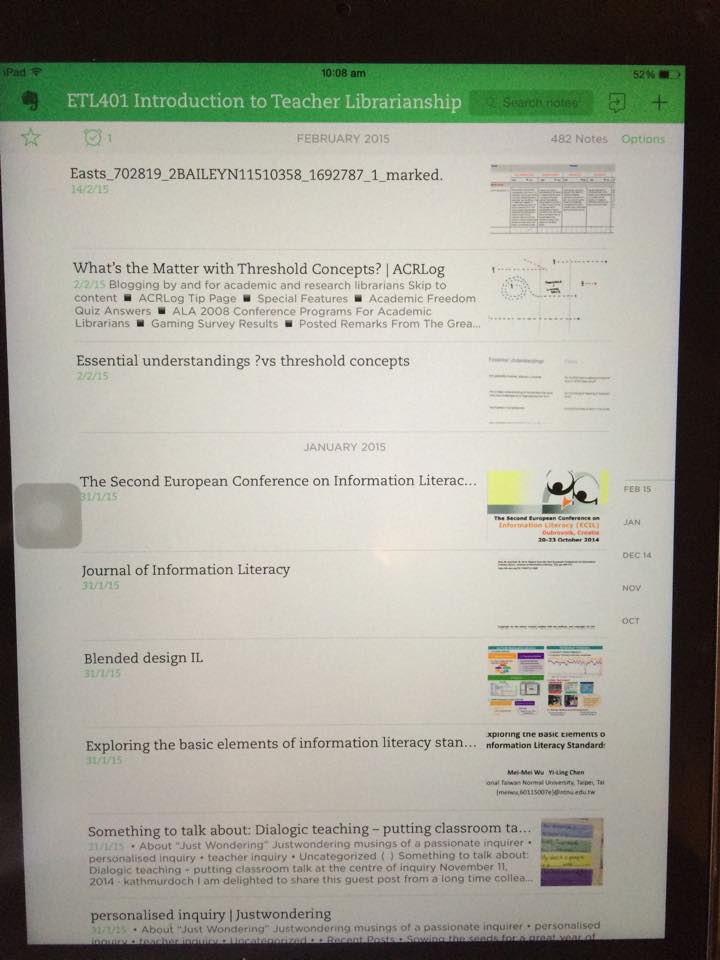 As you can see here my whole life is on Evernote – personal, professional and learning, each have their own notebook. You can also group notebooks together (I’ve put all my CSU courses into the CSU group, although I keep my most current course floating as it’s then easier – less clicks) to add to the notebook. Because Evernote is so wonderfully searchable, there is no need to file by module or topic, you can just tag notes if you want, or not.