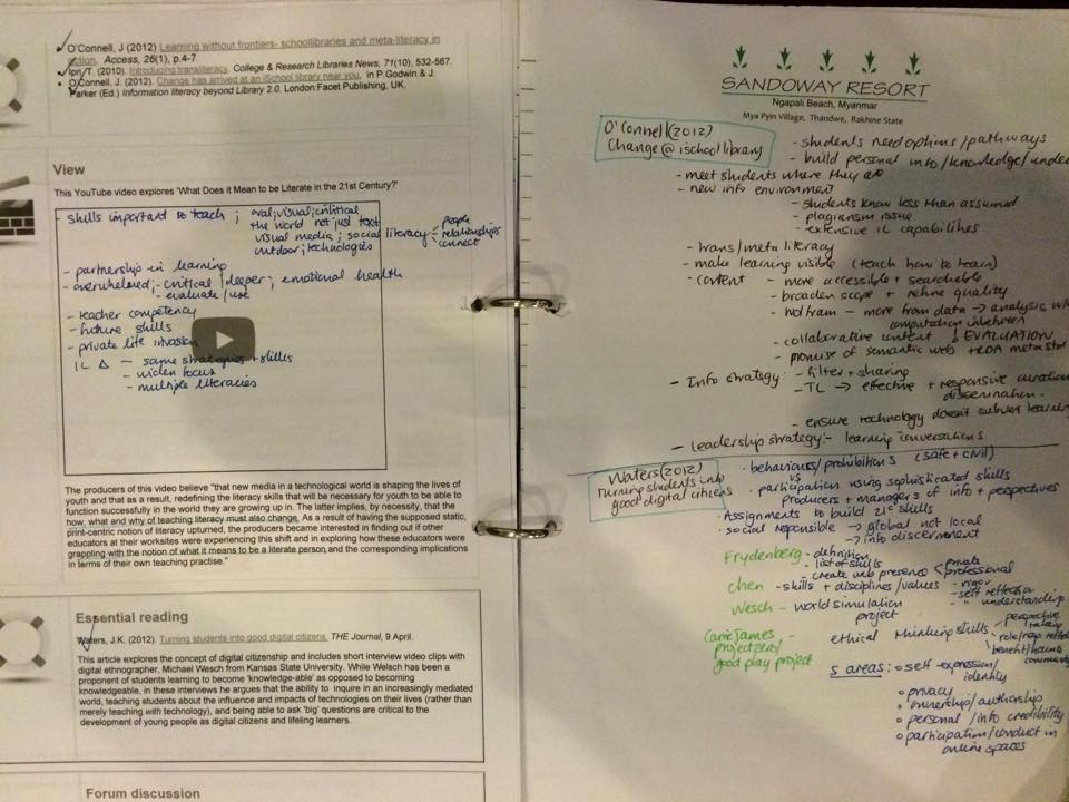 I take the next chunk of work I need to do and put the printed out modules in front of me. As I read the module, I tick the paragraphs. When I get to a reading, I will then open the reading in Evernote ( the search function is amazing) and start reading. As I read, I take notes on the blank left hand side of the module so it is opposite to where it is referred to in the module. I’ve made a personal convention for my note-taking. I do it in blue or black and put references to people and other readings in green and important items that I’ll want to refer to later in my assignments or blog posts or think more about in red. This is what it looks like (If I’ve printed the modules double sided, I put my notes on other paper as close to the module where it is referred to as possible). I don’t skim much to be honest, but some articles / book chapters etc. merit more note taking than others. Some are just a repetition and some are gold mines.